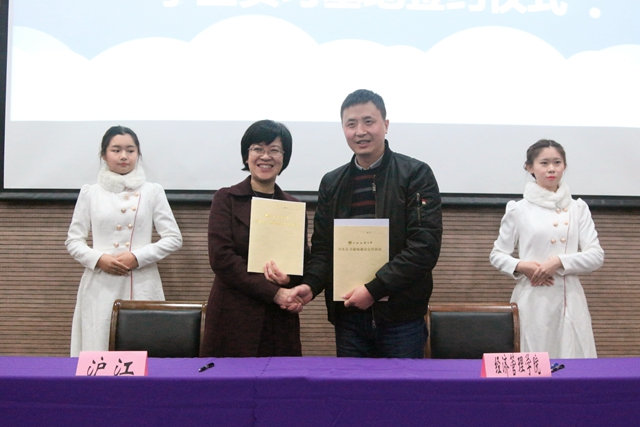 发布会现场,沪江首席教育官吴虹与经济管理学院党委副书记高涛签订共建协议,围绕大学生公益活动及大学生实习、实践基地等多方面展开全方位合作。