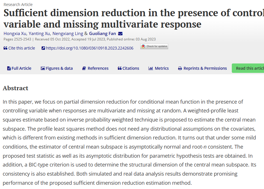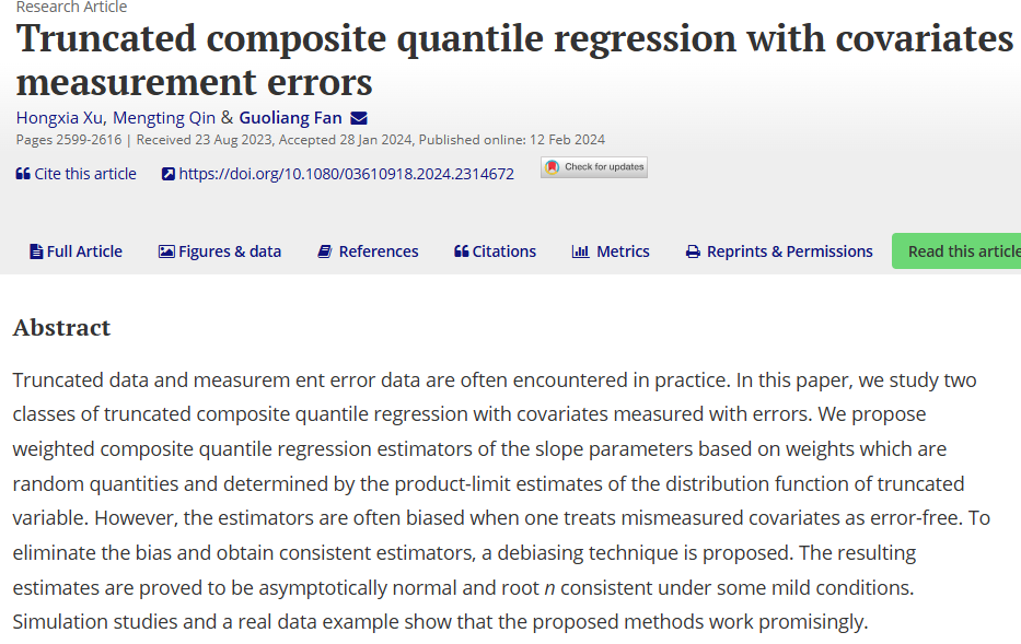 物流经济与统计系范国良老师及其合作者在《Communications in Statistics - Simulation and Computation》期刊发表学术论文